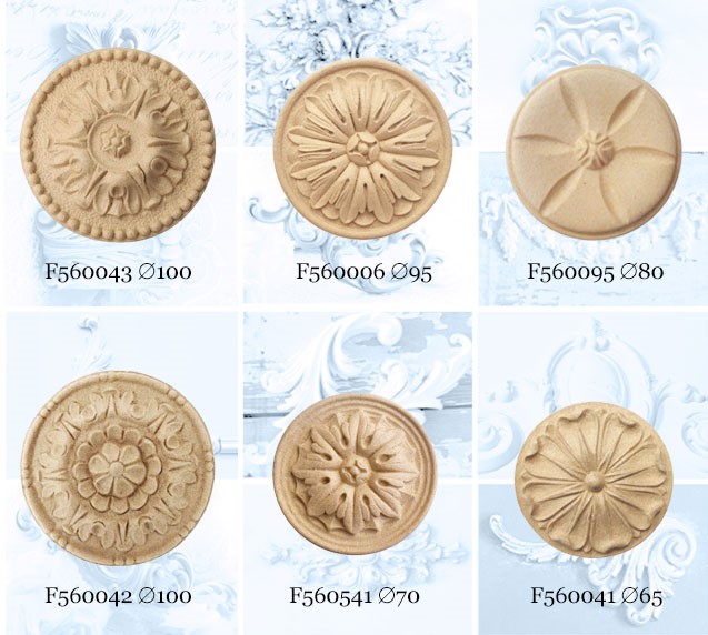 Zastosowanie: rozeta okrągła z pyłu drzewnego z motywem roślinnym – dekoracyjny ornament do mebli oraz innych powierzchni, nadający wnętrzom indywidualny i elegancki charakter.