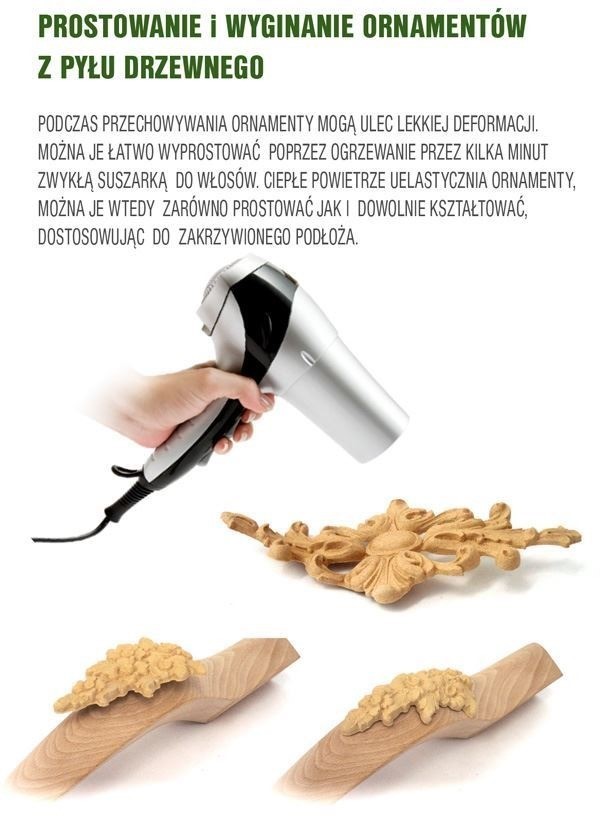 Ornamenty z pyłu drzewnego powstają z naturalnego pyłu drzewnego zmieszanego z klejem, tworząc elastyczne, lekkie ozdoby do mebli i wnętrz. Pod wpływem ciepła stają się plastyczne, co ułatwia montaż i formowanie.