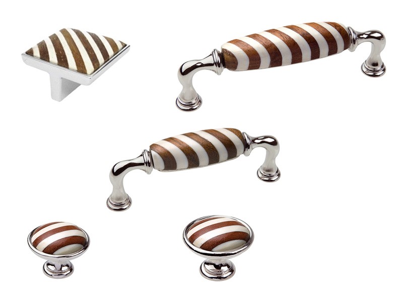 Uchwyty z unikatowej i ekskluzywnej serii łączą nowoczesne wzornictwo z najwyższej jakości rzemiosłem. Każdy egzemplarz jest niepowtarzalny – powstaje poprzez ręczną aplikację oddzielnych kawałków kości i mahoniu, które są precyzyjnie cięte, łączone i wykańczane. Połączenie tych elementów z bazą o wzornictwie vintage sprawia, że uchwyt zamontowany na meblu nadaje mu wyjątkową oryginalność.