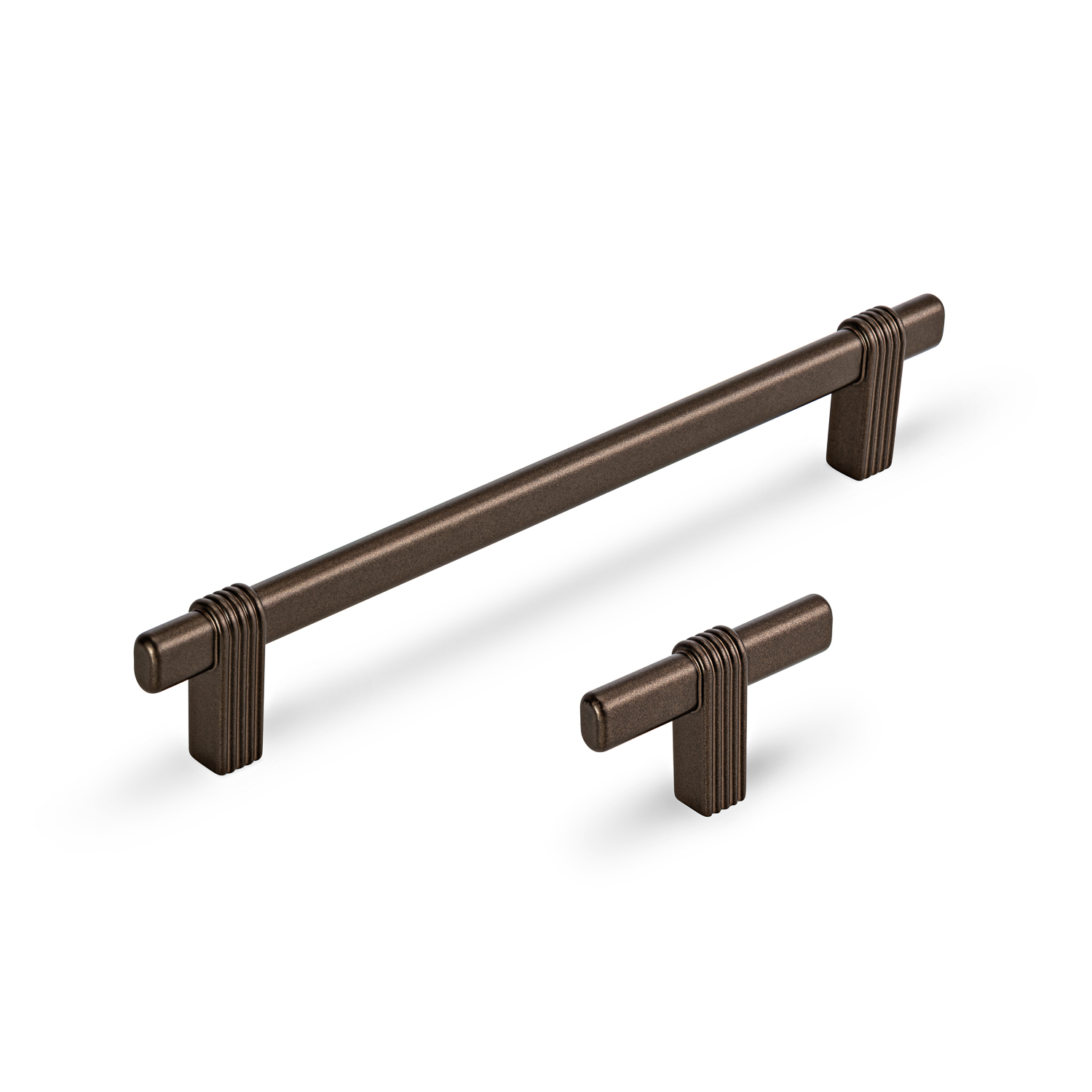 T-bar zachwyca architektoniczną formą i nowoczesnym charakterem. Równoległe ryflowania tworzą warstwowy detal, nadający konstrukcji rytm i głębię, podkreślając wysoką jakość wykonania. Brązowe, matowe wykończenie w swojej prostocie czyni uchwyt zarówno funkcjonalnym elementem, jak i stylową ozdobą mebla.