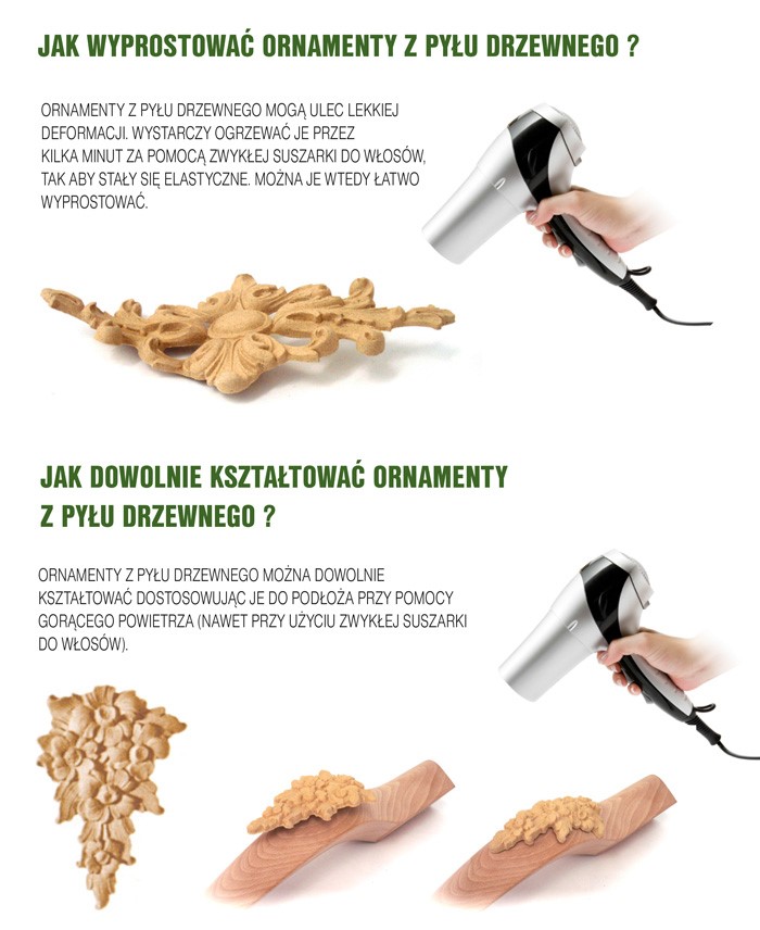 Ornamenty z pyłu drzewnego powstają z naturalnego pyłu drzewnego zmieszanego z klejem, tworząc elastyczne, lekkie ozdoby do mebli i wnętrz. Pod wpływem ciepła stają się plastyczne, co ułatwia montaż i formowanie.