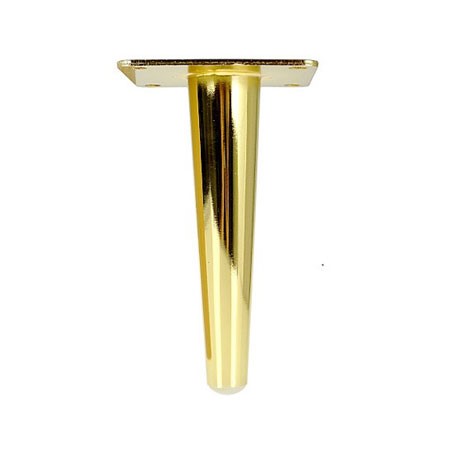Prosta, stalowa noga meblowa w kształcie stożka z przyspawaną blachą montażową to idealny wybór do nowoczesnych mebli. Wysokiej jakości stal pokryta złotym połyskiem nadaje jej elegancki, luksusowy wygląd, który doskonale komponuje się z komodami, szafkami nocnymi, szafami oraz meblami tapicerowanymi.