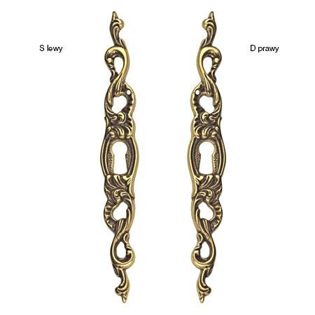 Załączony szyld meblowy to dekoracyjny element w stylu klasycznym, wykonany z mosiądzu. Charakteryzuje się smukłą, pionową formą oraz bogatymi, ażurowymi zdobieniami o roślinnych i falistych motywach. Centralnie umieszczony otwór na klucz meblowy pozwala na zastosowanie szyldu w tradycyjnych zamkach meblowych.