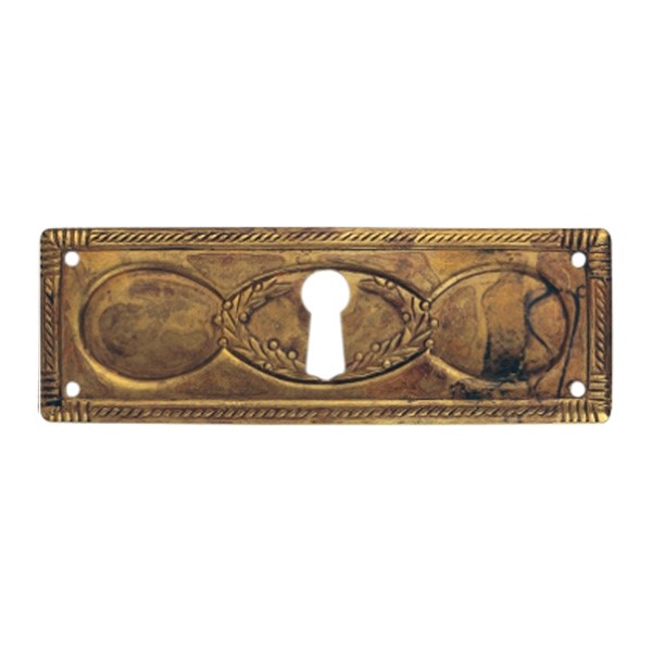 Prezentowany na zdjęciu szyld meblowy to prostokątny element wykonany z mosiądzu. Charakteryzuje się bogatym zdobieniem – centralną część szyldu zdobi wieniec laurowy otaczający otwór na klucz meblowy, a całość otoczona jest dekoracyjnym, plecionym rantem. Cztery otwory w narożnikach umożliwiają łatwy i stabilny montaż do frontu szuflady, komody lub witryny.