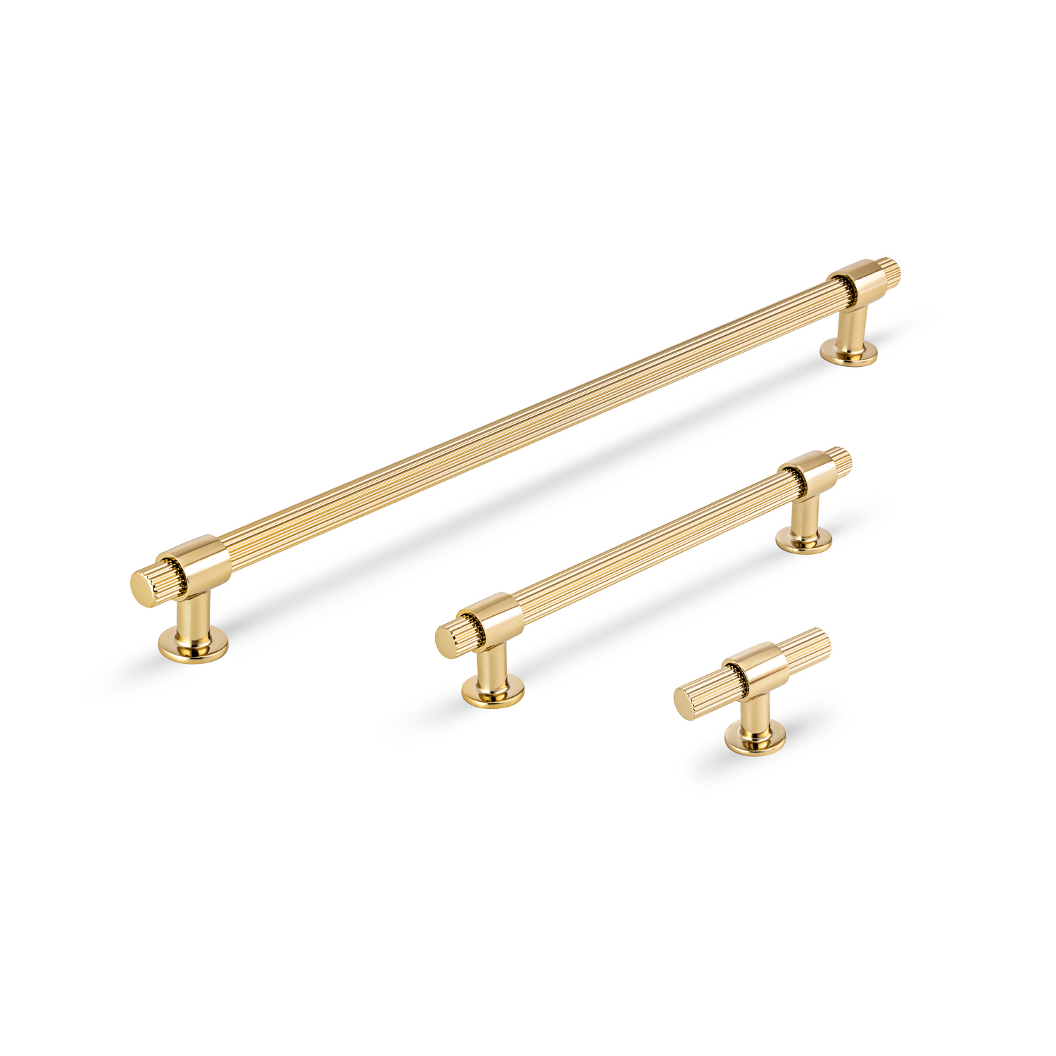 Uchwyt do mebli Ritmo Gold Lux to doskonałe połączenie klasycznej elegancji i rytmicznej harmonii detalu. Jego cylindryczna forma wzbogacona pionowym ryflowaniem tworzy efekt dynamicznego odbicia światła, które zmienia się w zależności od kąta patrzenia, wydobywając subtelne refleksy i unikalny charakter.