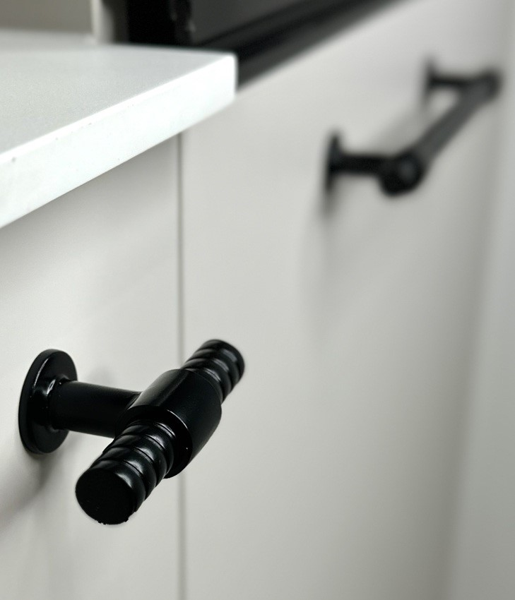 Gałka do mebli typu T-bar Fiero czarny mat to efekt poszukiwania formy łączącej siłę i subtelność. Jej linia rytmicznych podziałów daje wrażenie ruchu i zmienia charakter pod wpływem światła, nadając meblom dynamiczną głębię.