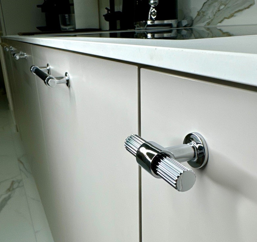 Gałka do mebli typu T-bar Ritmo Chrom Połysk to klasyczna elegancja połączona z rytmiczną harmonią detalu. Jej cylindryczna forma, ozdobiona precyzyjnym, pionowym ryflowaniem, wprowadza wyjątkową dynamikę odbicia światła, tworząc subtelne, a zarazem dekoracyjne refleksy podczas każdego ruchu i zmiany kąta patrzenia.